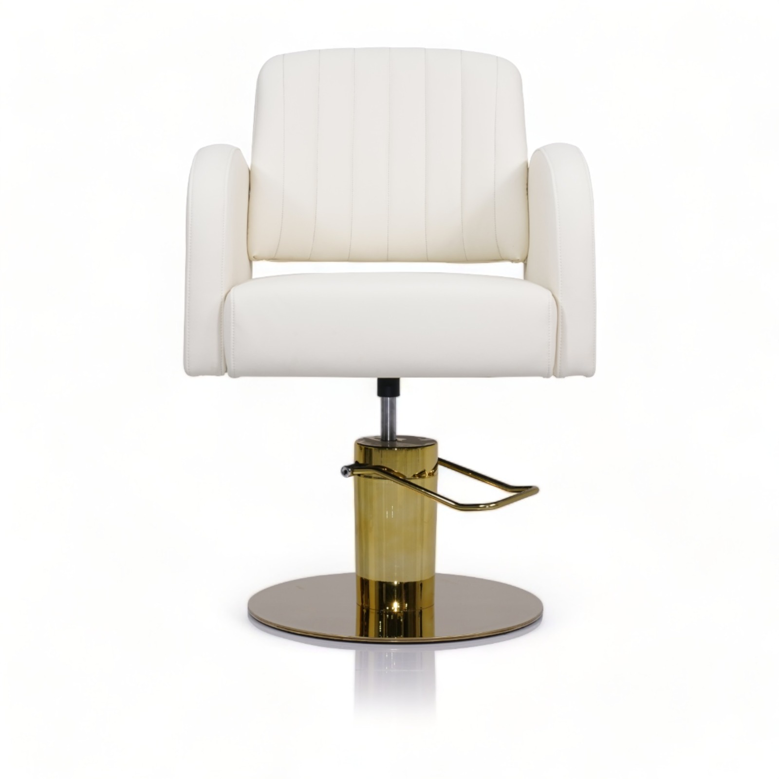 La poltrona MIRANDA.BE combina eleganza e comfort, con un rivestimento in similpelle bianco panna e piedi in oro che donano un tocco di raffinatezza. La seduta imbottita e la regolazione idraulica dell’altezza assicurano un’esperienza confortevole e pratica per i clienti.