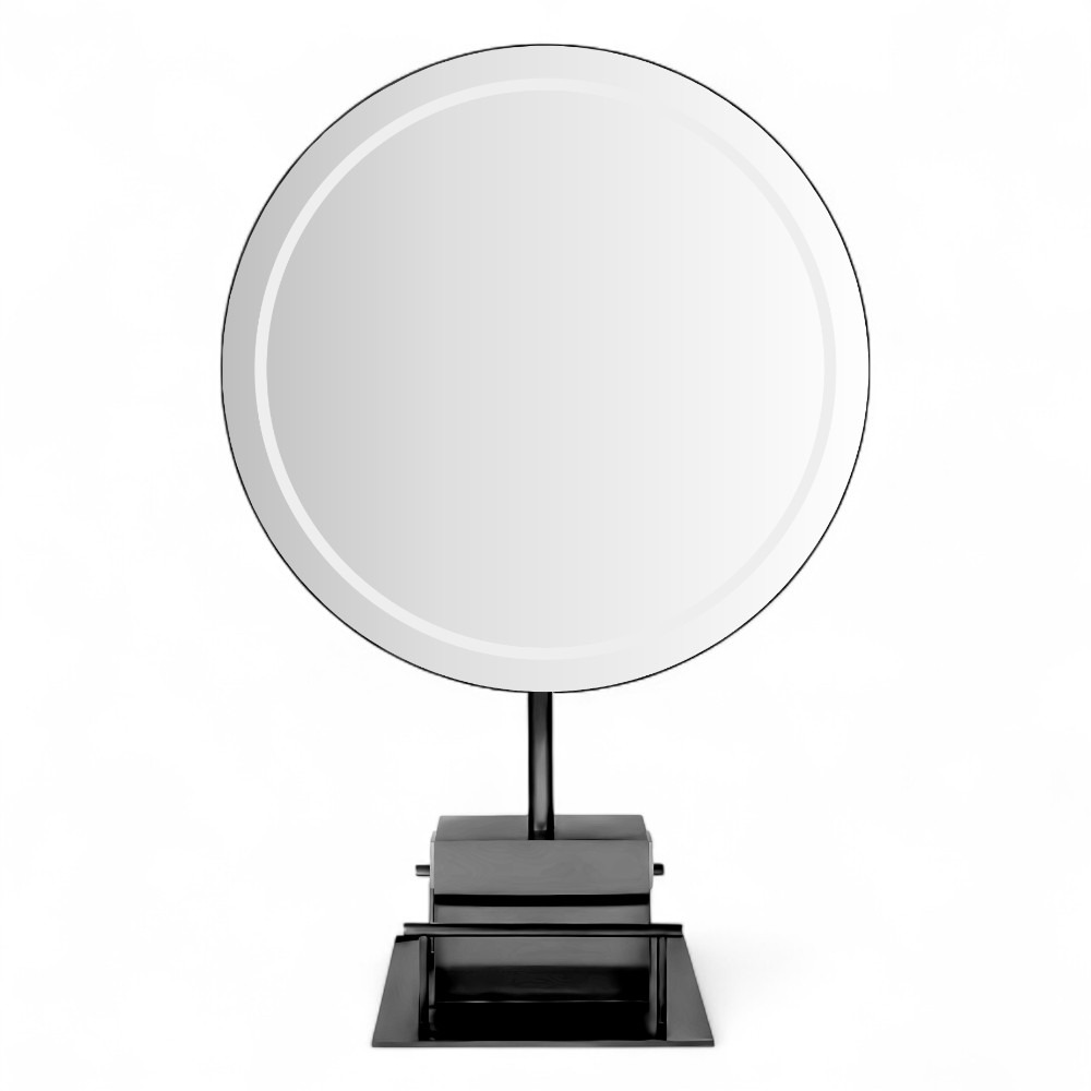 Lo specchio ALGOL.BLACK si distingue per il suo design elegante e minimalista, caratterizzato da una struttura in acciaio con finitura satinata. La base stabile e il supporto integrato lo rendono funzionale e pratico per l’uso quotidiano. Ideale per saloni moderni e professionali, lo specchio ALGOL.BLACK combina estetica contemporanea e qualità, offrendo un tocco di classe a qualsiasi ambiente.