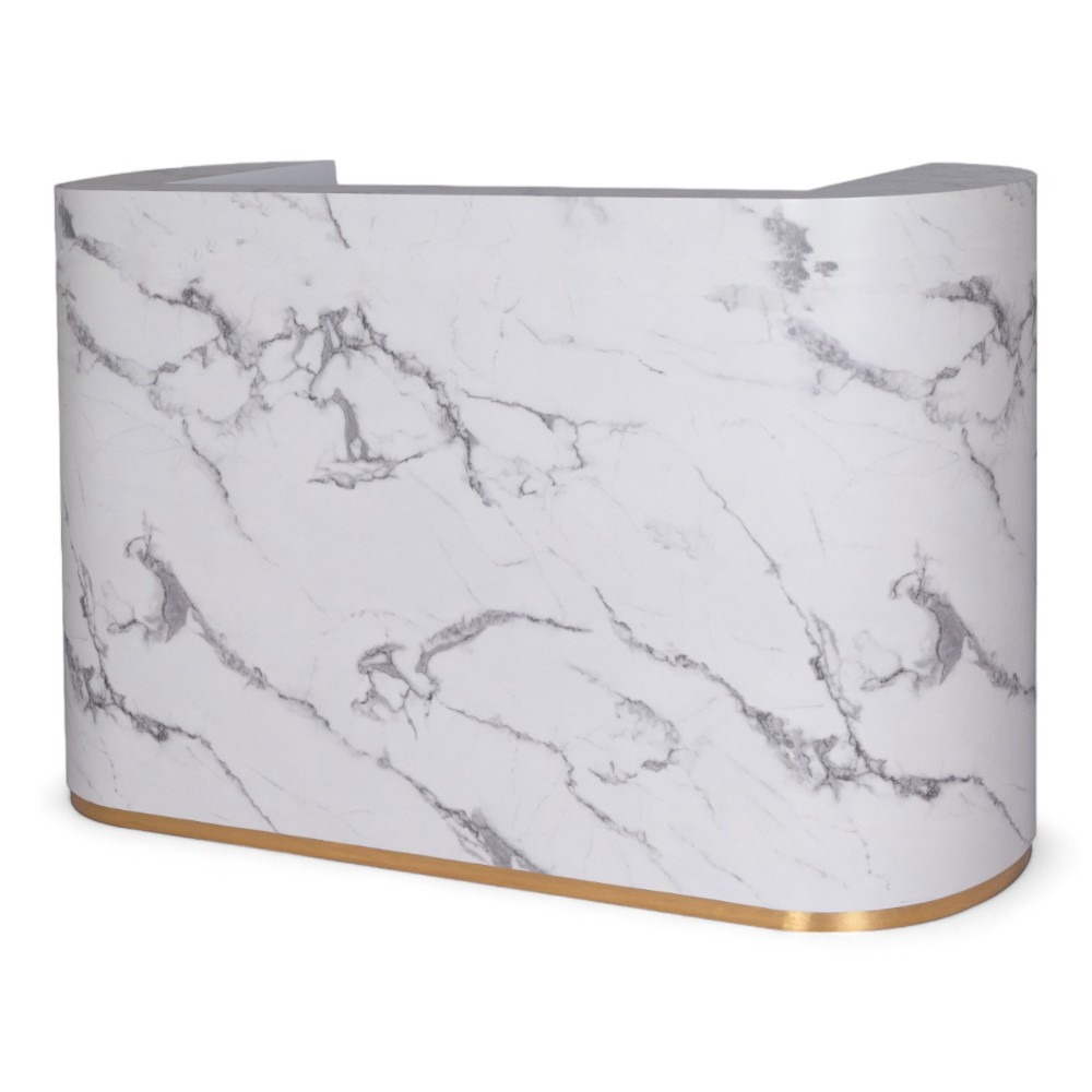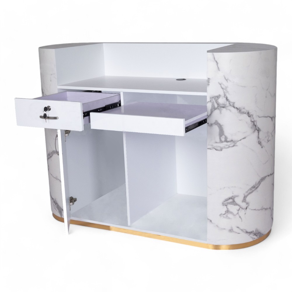 Con il suo design effetto marmo bianco, la reception TULIO aggiunge un tocco di lusso e raffinatezza al salone. Ideale per ambienti moderni e di classe, offre funzionalità e un look esclusivo, perfetto per accogliere i clienti con stile.